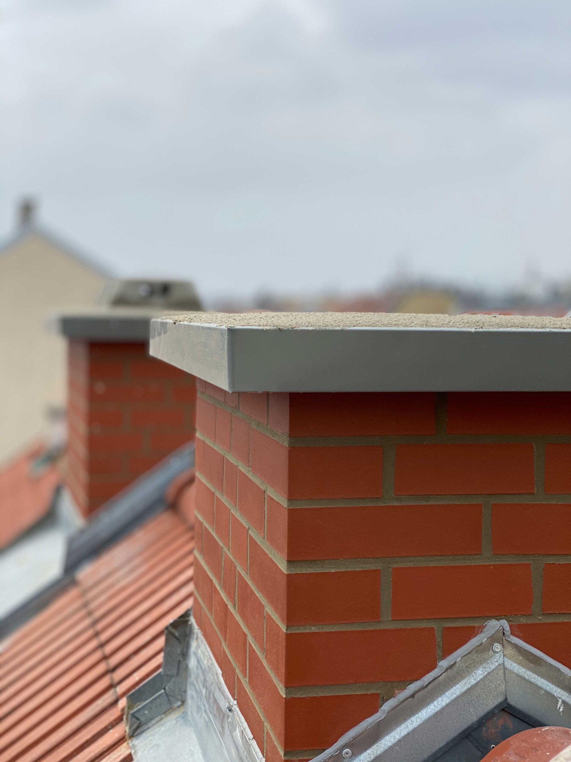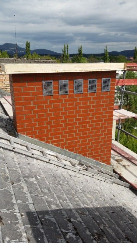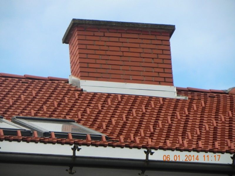 Bei der zweiten, ebenso sehr häufig gewünschten, Variante wird das Kaminkopfmauerwerk mit Normalformatmauerziegeln im Binderverband erneuert. Im Anschluss sollte das Mauerwerk zur Erreichung der Feuerwiderstandklasse EI 90 (lt. ÖNORM EN 1996-1-2) mit einer Mindestputzdicke von 10 mm, verputzt werden. Als Abschluss empfehlen wir das Kaminmauerwerk über Dach mit einem geeigneten wasserabweisenden Außenputz zu versehen. Aufgrund der Eigenschaft, dass NF-Mauerziegel Wasser aufnehmen, kann es zur Fleckenbildung, sowie im Winter zu daraus resultierenden Frostschäden führen.