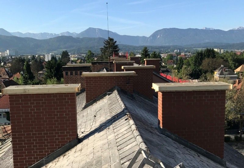 Die Kaminkopfsanierungsarbeiten erfolgen von außen über Dach um die Verschmutzung im Gebäudeinneren so gering als möglich zu halten.